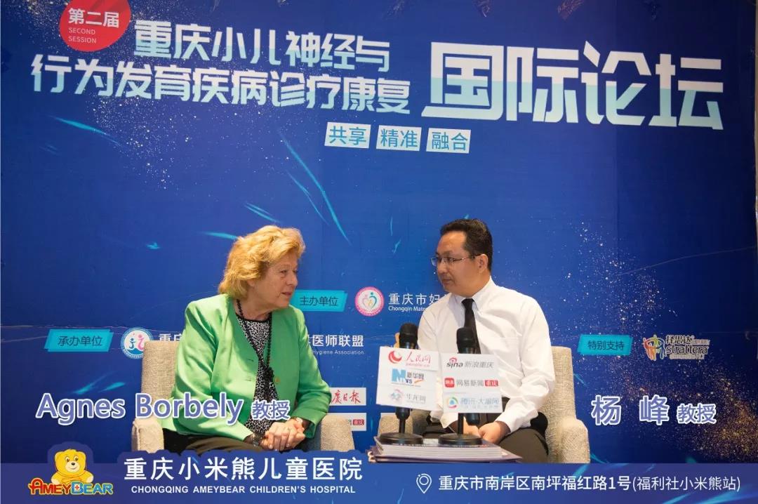 匈牙利布达佩斯理工大学康复专科工程学院Agnes Borbely教授(左)和深圳市儿童医院言语治疗科主任杨峰教授(右)在论坛现场接受媒体采访